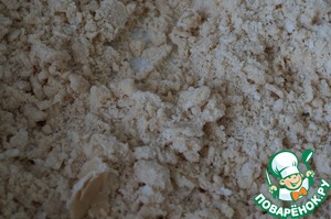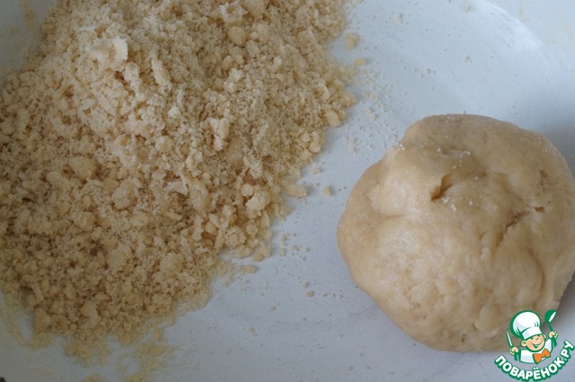 Разделим ее на две части. Из одной замесим вот такой и уберем его в холодильник. Вторую часть еще раз тщательно перетрем руками и оставим в виде крошки.