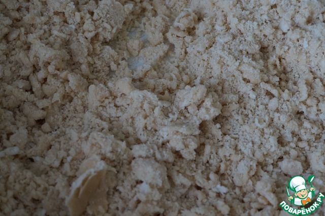 Добавляем воду и муку, все перемешиваем, получаем вот такую крошку.