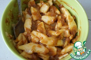 После того, как яблоки дадут сок добавим сгущенку и перемешаем.