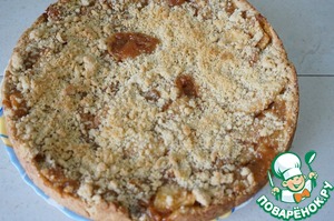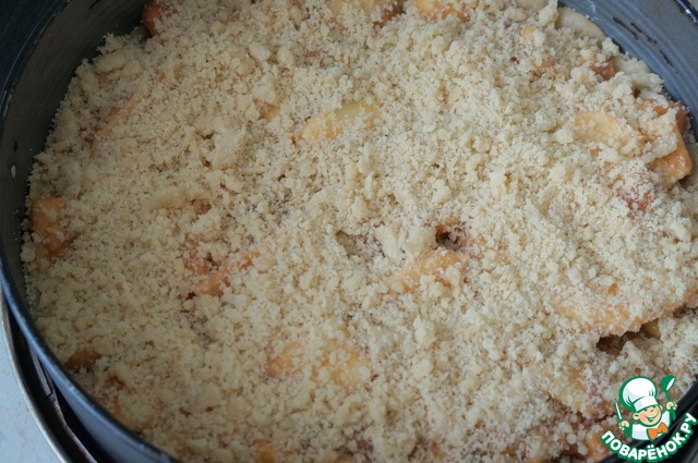 Сверху засыпаем нашей крошкой. Ставим в предварительно разогретую до 180 градусов духовку минут на 30. Впрочем каждый ориентируется по своей духовочке.