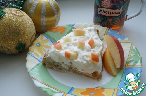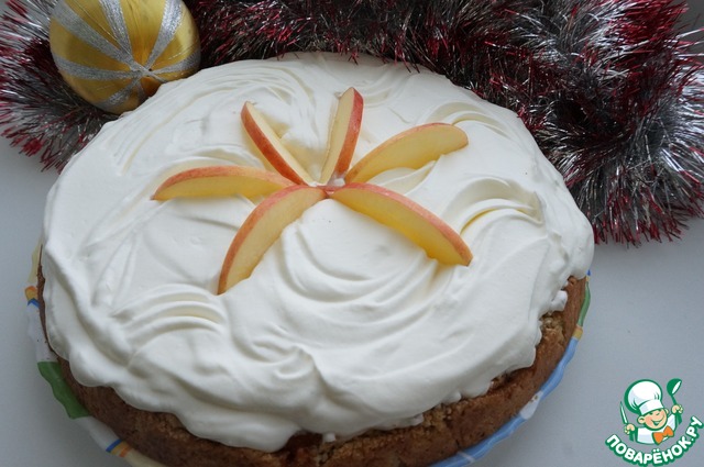 Распределяем сливки по нашему пирогу. Я еще украсила дольками яблок.