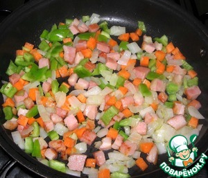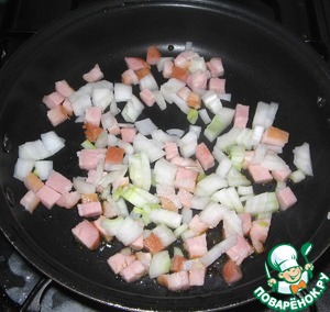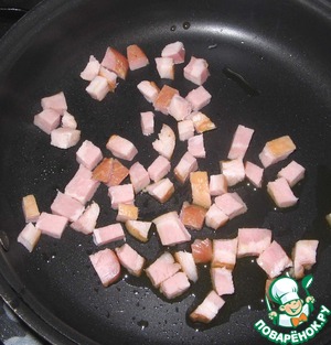 Бекон варено-копченый нарезать кубиками и обжарить в сковороде.