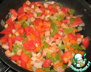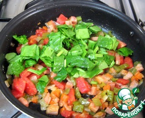 Помидоры очистить и убрать семечки. Мякоть нарезать кубиками и добавить в сковороду к овощам. Прогреть несколько минут.