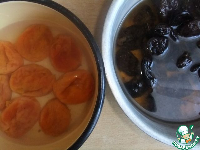 Тем временем приготовить начинки: Чернослив залить горячей водой на полчаса. С курагой поступить так же. Белки взбить в крепкую пену,