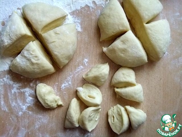 Приступить к формовке. Тесто промесить, разделить на три части. Одну немного поменьше по размеру. Каждую часть разделить еще на четыре, меньшую - на девять частей.