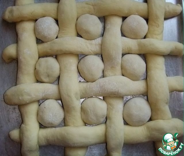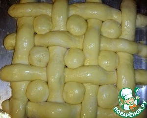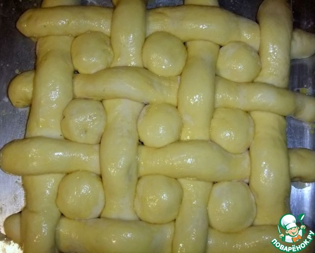 Переплести трубочки по типу корзинки. Вдоль - одной начинкой, поперек - с другой. В образовашиеся отверстия поместить 9 булочек с курагой. Поставить в теплое место.
