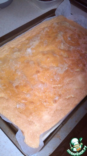 Протвень (мой размером 27*38) устелить пергаментной бумагой и вылить бисквитное тесто. Аккуратно ложкой разровнять, чтоб слой теста был везде равномерный -