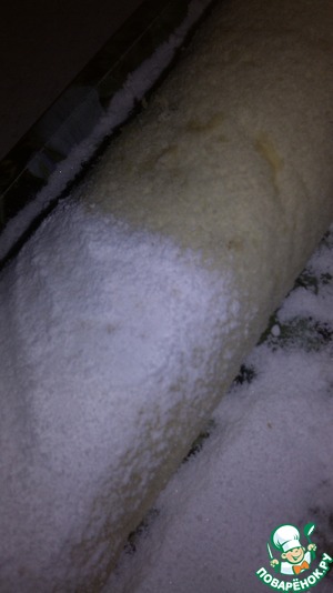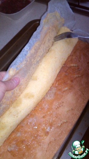 Скручиваем бисквит в рулет, по немногу отделяя его вилочкой от пергамента.