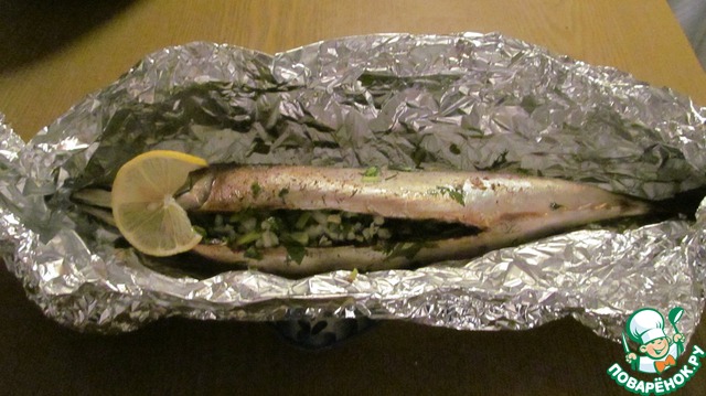 Нашу нафаршированную рыбку выложить на фольгу и аккуратно завернуть, чтоб фольга не порвалась, выложить на противень, запекать в духовке при температуре 180 град. 40 мин.