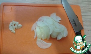 Тонко шинкуем лук. Вид нарезки не принципиален, но чем тоньше, тем быстрее спассируется лук.