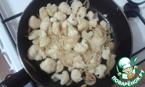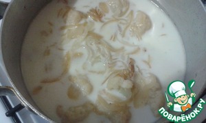 В кастрюлю наливаем молоко, доводим до кипения и добавляем в него обжаренную цветную капусту с луком. Провариваем все вместе до размягчения цветной капусты.