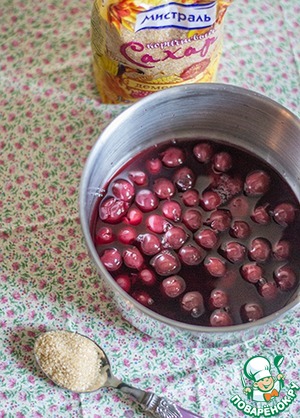 В кастрюлю вылить вишню вместе с сиропом. Добавить сахар, размешать.
