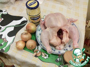 Итак, начнём. Немного комментариев относительно ингредиентов. Для рецепта нам понадобится, собственно, курица, или вернее цыплёнок бройлер весом примерно 2 кило. Цифры приведены именно для такого цыплёнка.