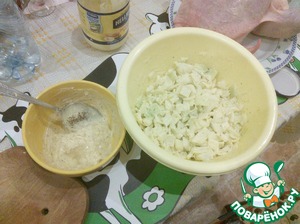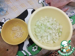 Лук нарезаем крупными кубиками. Я ещё его расслаиваю, чтобы получились пластинки, если сам не разваливается. "Правильными" кусочками я считаю пластинки лука из одного слоя, с поверхностью примерно 1 кв. см. Но, естественно, линейкой измерять не надо, тут уж как получится :-) Главное - не резать слишком мелко. Чеснок давим плоскостью ножа и режем как можно мельче. Можно и с помощью специальной давилки чеснока, но тогда лучше давить сразу в майонез, чтобы ни капли сока не потерять.