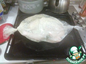 Раскаляем духовку до максимума (потом убавим). Суём курицу в мешок для выпечки, завязываем с двух сторон. Желательно соблюсти несколько моментов: оставить с каждой стороны сантиметров по пять свободного пространства; оставить внутри мешка как можно меньше воздуха; связать крепко, но при этом оставив возможность излишкам воздуха выйти, не повредив мешок. Смазываем противень небольшим количеством масла - в случае, если мешок не очень качественный - это может сохранить его, даже если и немного расплавится, то не пригорит. Ставим всё это дело в центр духовки, уменьшаем температуру до 180 градусов, и оставляем на 1 час и 30 минут.