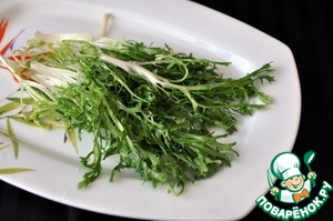 На блюдо кладём помытые и обсушенные листья салата, у меня фризе.