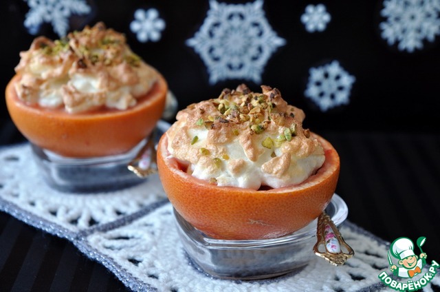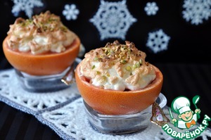 Берём грейпфрут, моем, разрезаем пополам, вырезаем середину, оставляя "чашечки" целыми.