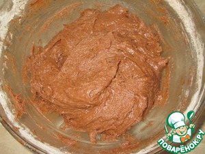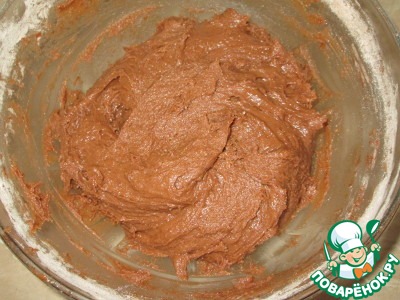 В два приема ввести сухую смесь, хорошо перемешать. Это лучше делать силиконовой лопаткой, тесто будет довольно плотное