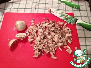 Разогреть в сковороде оливковое масло и выложить в него лук. Обжарить до золотистого цвета. Добавить шампиньоны и томатную пасту, перемешать и тушить минут десять.