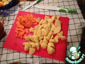 Нарезать морковь полукольцами. картофель крупными кубиками.