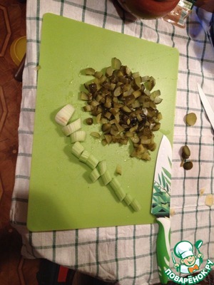 Мелко нашинковать солёные огурцы. Стебель сельдерея нарезать средними кусками.