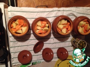 Далее, в произвольном порядке закладываем в горшочки солёные огурцы, овощи, оливки, пассировку...
