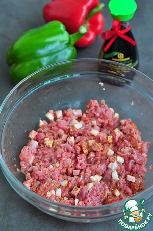Добавить все специи, соль по вкусу, 1 ст. соевого соуса, мелко нарезанный бекон (бекон тоже можно смолоть вместе с мясом).