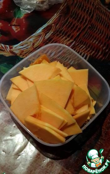 Очищаем тыкву от кожуры и нарезаем тонкими ломтиками.