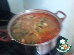 Выкладываем заправку в кастрюлю с сомом, солим. Варим на маленьком огне 7 минут. За 3 минуты до готовности добавляем зелень и перец.