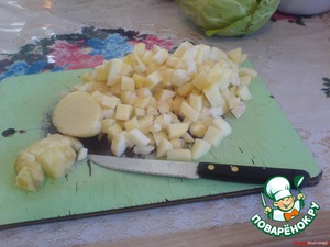 После повторного закипания добавить в кастрюлю к сому, картофель, дать покипеть 5 минут. Затем положить в кастрюлю капусту. Варить все 15 минут.