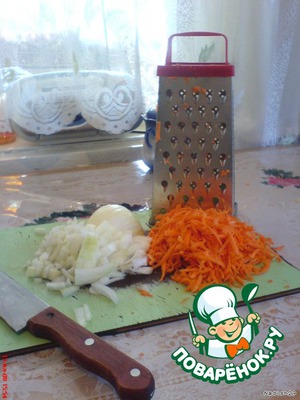 Лук нарезать мелко, пассировать на рафинированном масле до золотистого цвета. Добавить морковь, натёртую на крупной тёрке. -