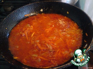 Через 5 минут добавить в сковороду к луку и моркови 2 ст. л. томатной пасты, 1/2 ст. бульона из кастрюли. Тушить всё 5 минут. Затем добавить 1 ст. л. муки, перемешать и отключить.