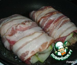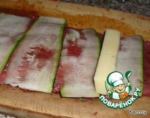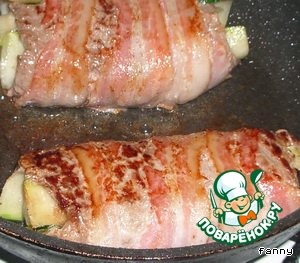 Цуккини нарезать тонкими широкими полосками с помощью овощерезки или ножа для сыра, выложить их поперек мясных кусков, в полученные стейки завернуть по 2 брусочка сыра, обернуть рулетики полосками бекона и обжарить их на сковороде с двух сторон.