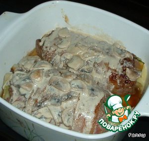 Рулетики переложить в форму, добавить грибы в сметане и поставить в духовку на 35 -40 минут на 200 *