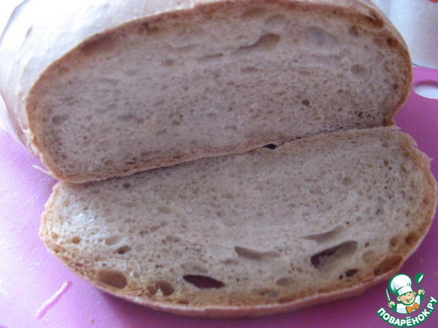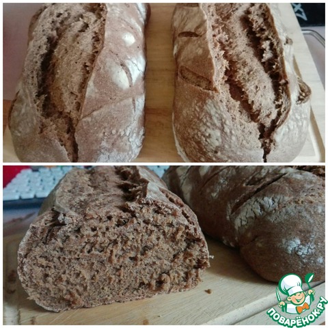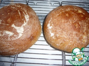 Выпекать в предварительно разогретой до 230С духовке на пару (одновременно с противнем ставим вниз миску с кипятком). Перед посадкой в печь хлеб сбрызнуть холодной водой. Через 10 минут выпекания, вынуть миску с кипятком и снизить температуру до 200С. Выпекать 40 мин., ориентируйтесь на свою духовку. Готовый хлеб выложить на решетку и оставить до теплого состояния, затем прикрыть полотенцем.