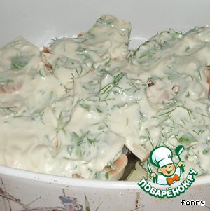 Приготовить соус из сметаны, майонеза и рубленой зелени.