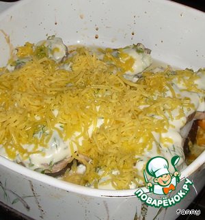 Затем посыпать тертым сыром и запекать еще 10 минут.