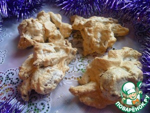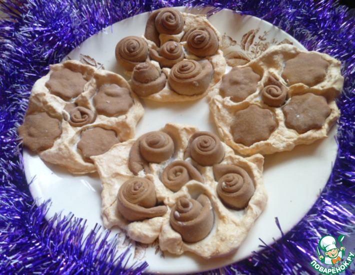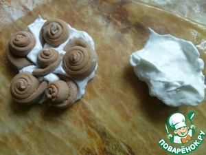 На пергамент выложить полную столовую ложку безе, сверху на безе выложить спиральки в виде цветочка, вдавить. -