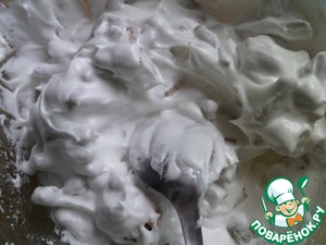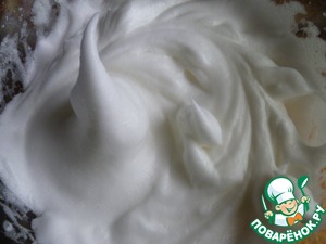 Далее делаем безе: холодные белки миксером взбиваем в крепкую пену, по 1 столовой ложке добавляем сахар ( 5 столовых ложек), каждый раз хорошо взбивая, затем добавляем ванильный сахар, снова взбиваем до крепких пиков.