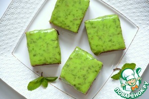 Нанести глазурь на остывший бисквит. Я не ждала, пока глазурь остынет, и нарезала сразу на квадратики. Мятная глазурь аппетитно стекала по бокам...