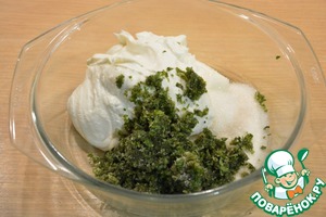 Для приготовления начинки мяту перемолоть в блендере или мелко-мелко нарезать ножом. Смешать творог с сахаром и мятой.