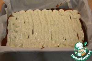 Осторожно распределить поверх теста творожную массу (для этого удобно использовать кондитерский шприц), затем залить оставшимся тестом. -