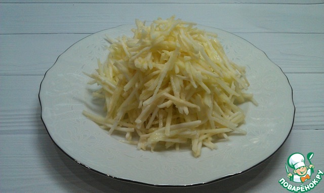 Зеленые яблоки очистить от кожуры, натереть на крупной терке. Яблоки чуть отжать от сока, но без фанатизма.