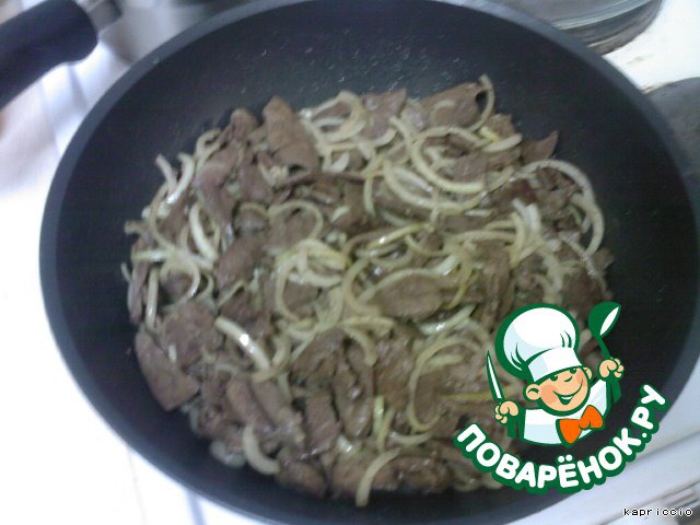 • Режем лук полукольцами - добаляем к печени, жарим еще минут 5