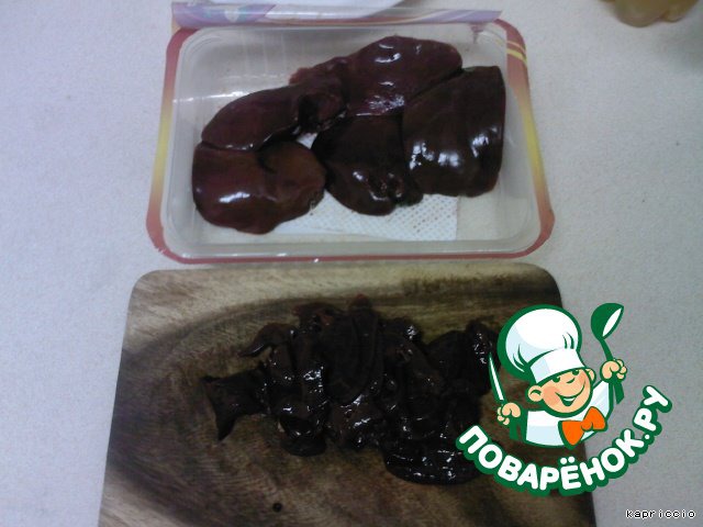 • Печень промываем в холодной воде, нарезаем тоненькими пластинами