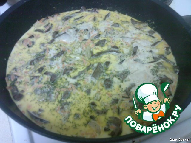 • Теперь самое время посолить, поперчить, добавить сливки и бульон, перемешать, поставить на слабый огонь, накрыть крышкой и оставить тушиться на 30 минут