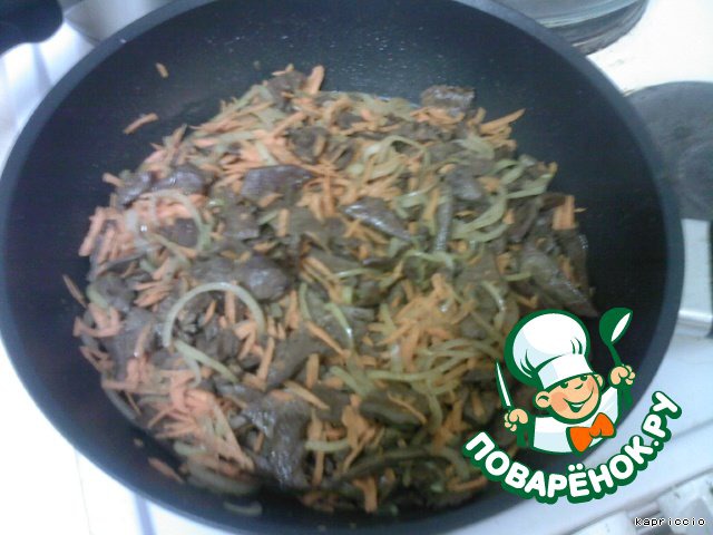 • Морковь натереть на крупной терке и тоже добавить в печени, тушить минут 5