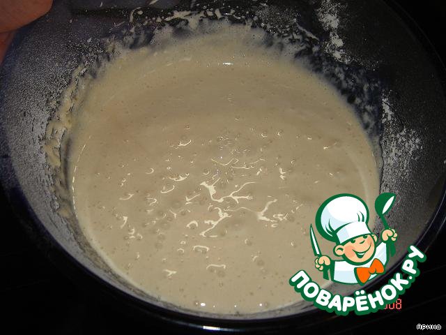 • Смешать сахар и яйца, взбить до увеличения в объеме почти в 2 раза, добавить муку и довести всё до однородной консистенции