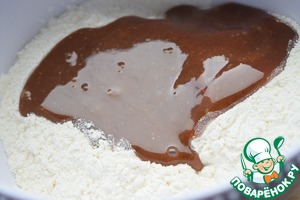 Смешать муку и разрыхлитель. Добавить остывшую медовую смесь.