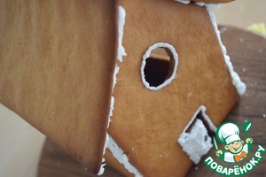 - крыша никак не хотела держаться, потому что глазурь застывает не так быстро, но я нашла выход из положения, намазала края деталей глазурью, оставила их ненадолго для подсыхания (минут 10-15), а потом соединила, все отлично склеилось!